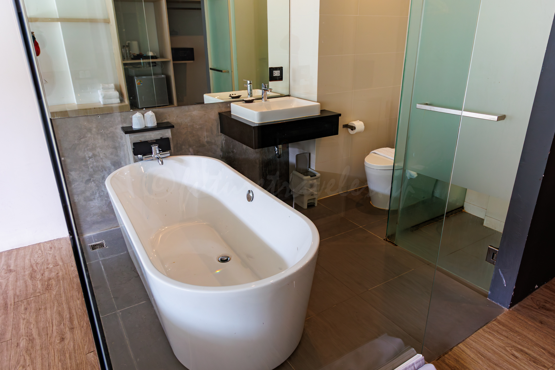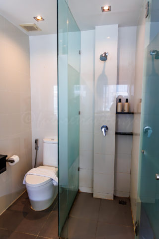 リゾートでよくあるガラス張りのバスルームになります。バスタブが分かれているタイプなので使いやすいかといえばそうではないと思います。
