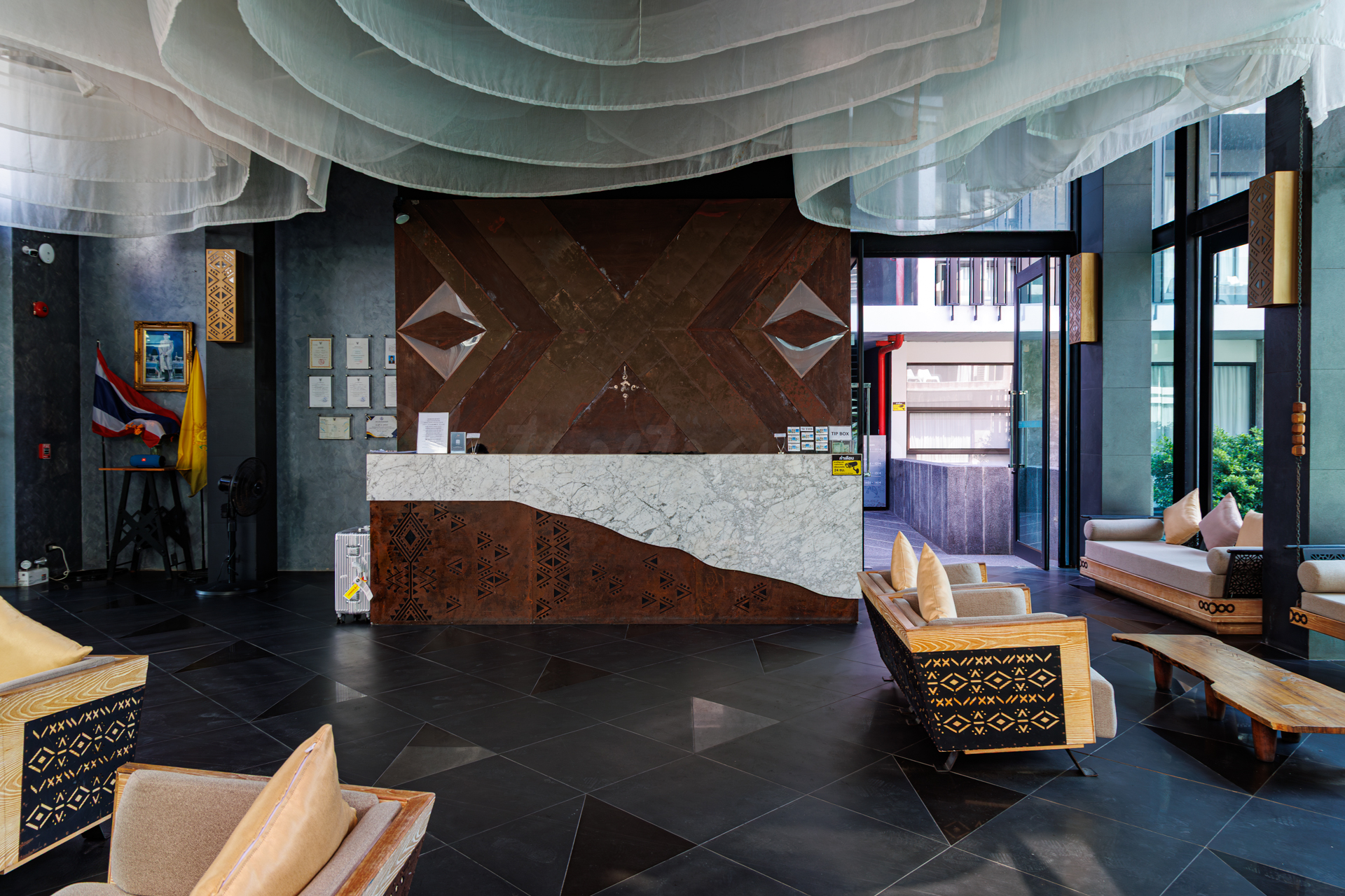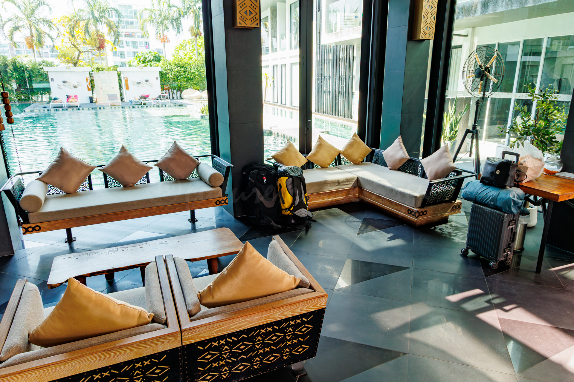 開放的なよくあるリゾートホテルのロビーという感じです。要するに日中は暑い...けど、チェックイン街をする人などが使っていいたので待つのにはいいのかなという感じです。